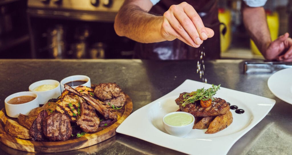 Grillad ryggbiff med stekt potatis, stekta grönsaker och pepparsås.